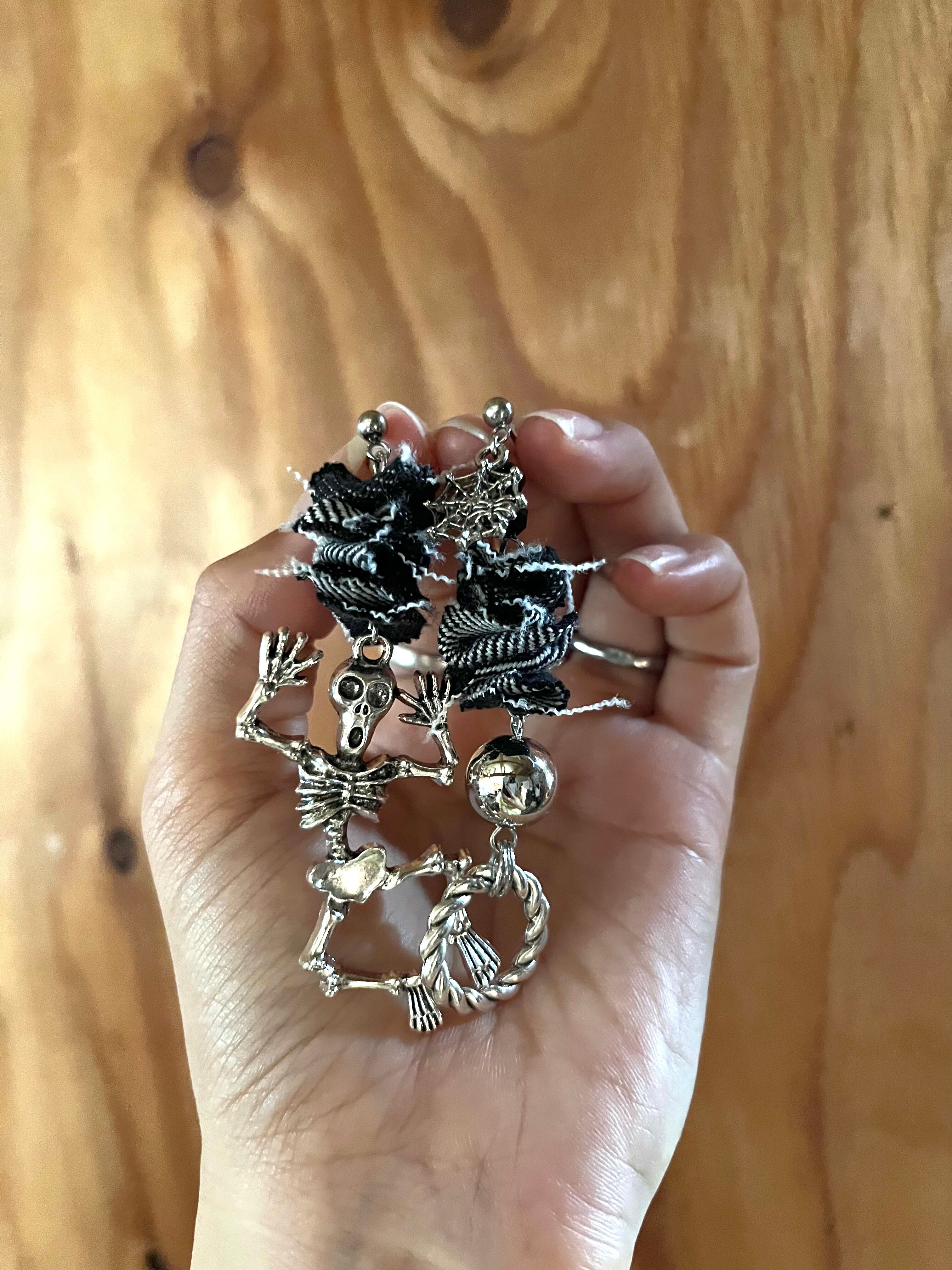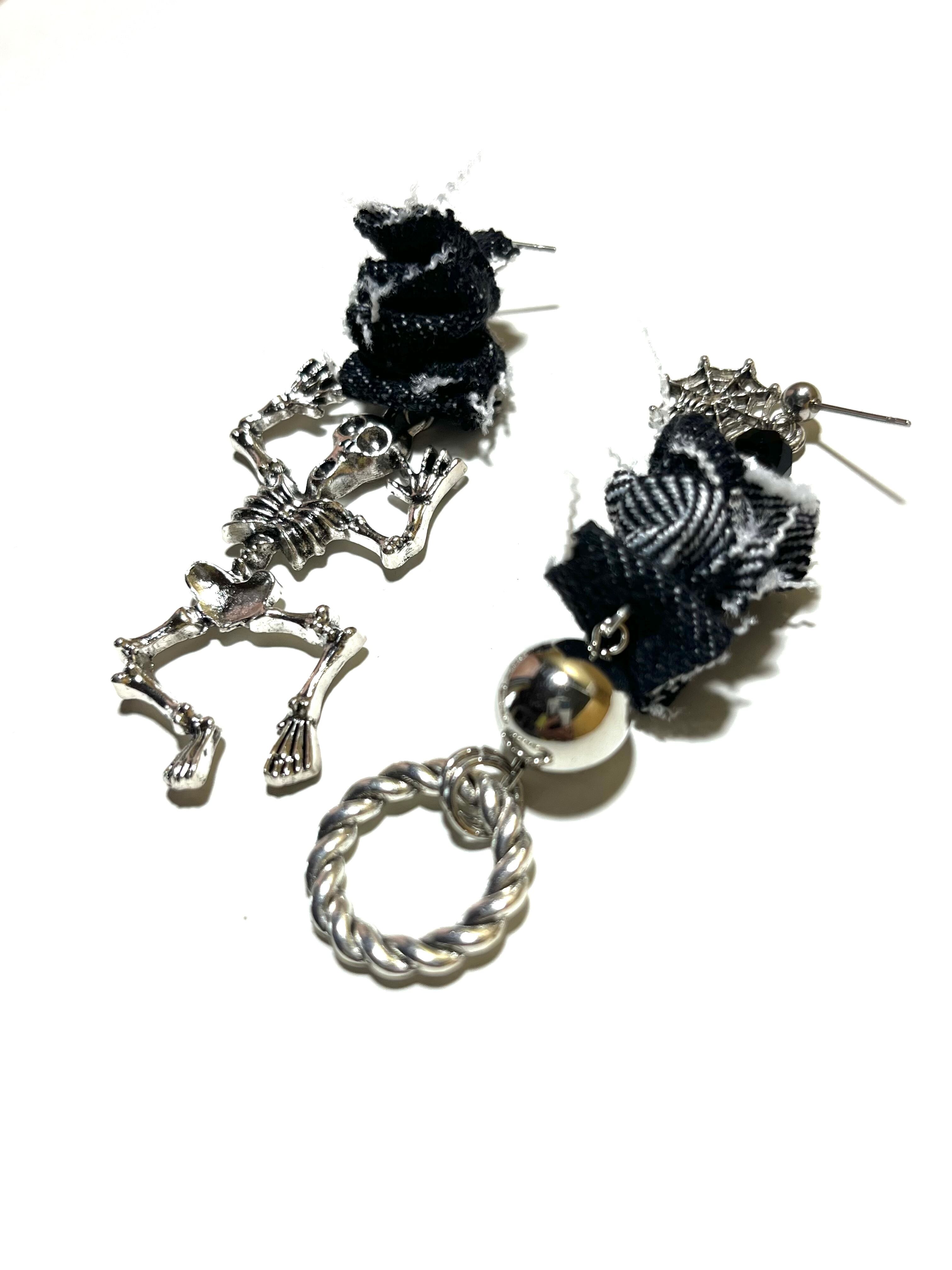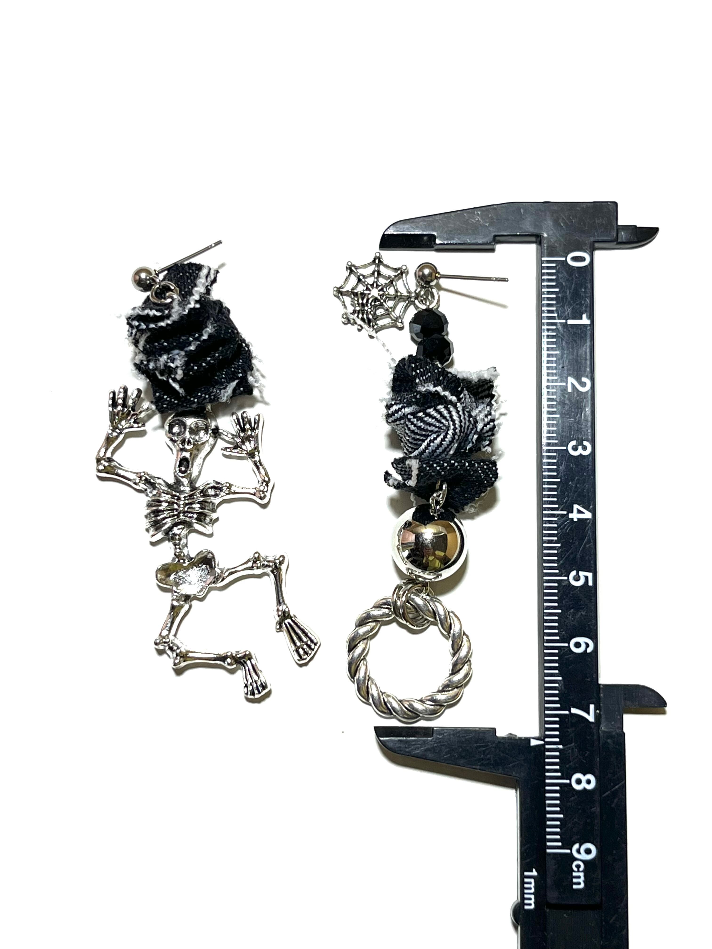 No.181 ガイコツくん ハロウィン 大ぶり シルバー ブラックデニムデニムピアス ピアス 軽い ステンレス シルバー 大ぶり チェーン 合金 カッコいい 金属アレルギー 個性的 個性派 クリア シリコンキャッチ | あいにー