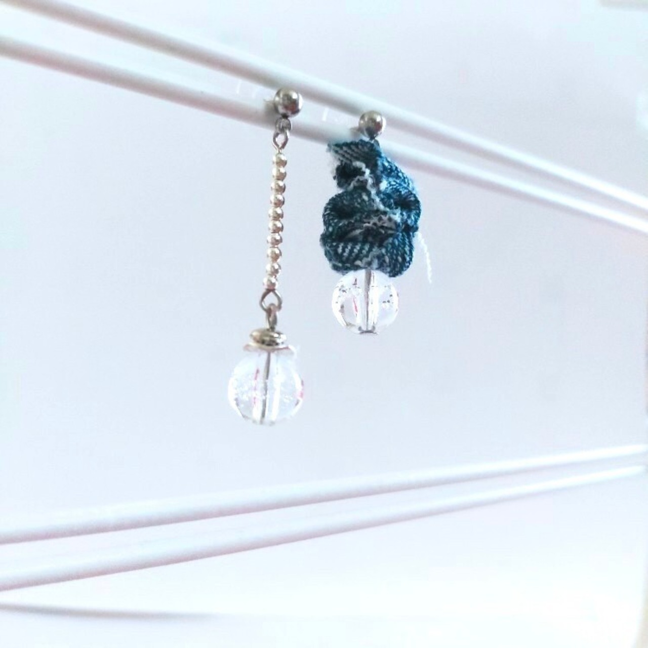 デニムとバブルビーズの長めに揺れる玉でアシンメトリーにしました。