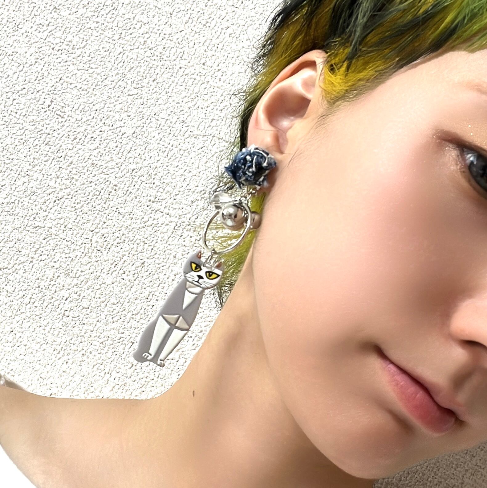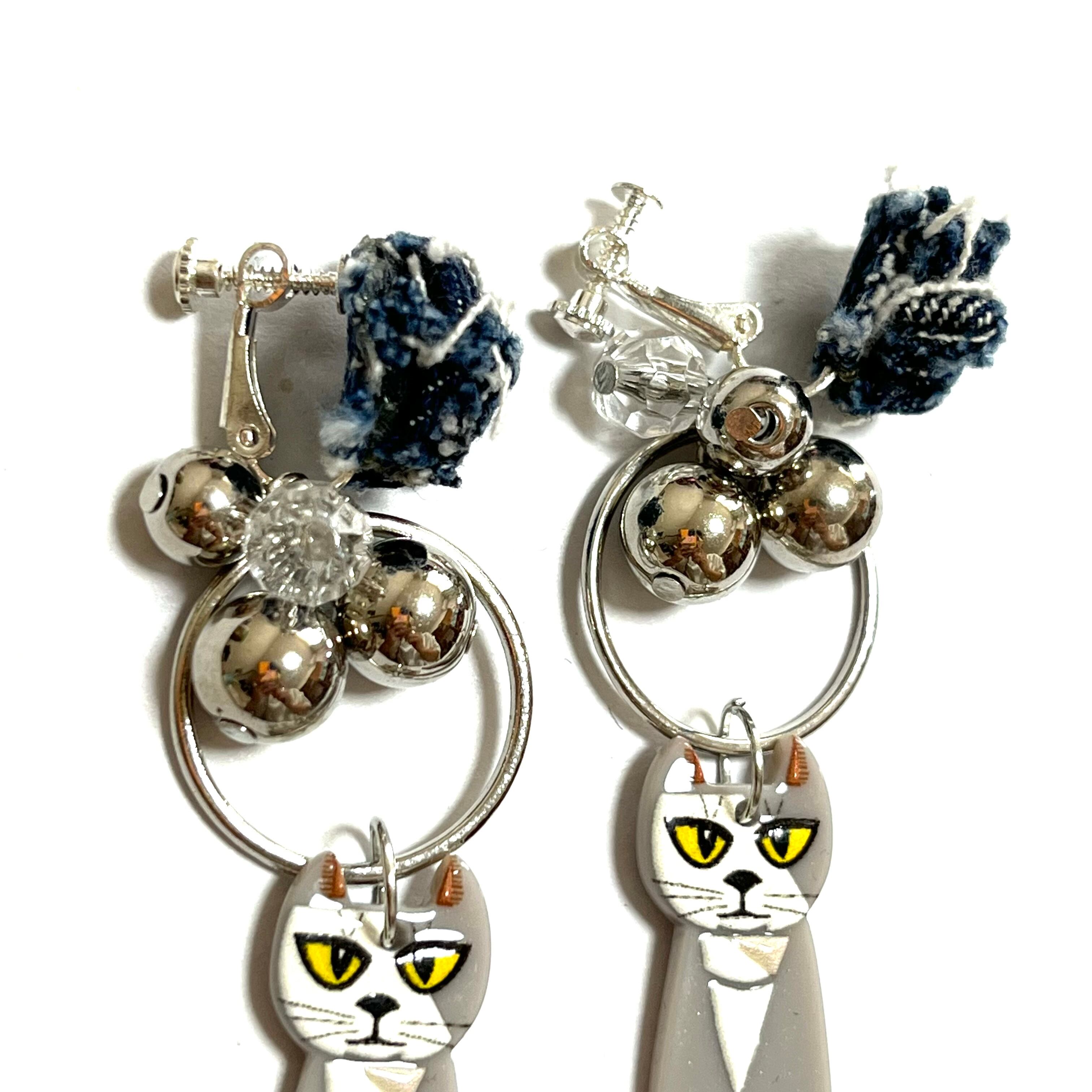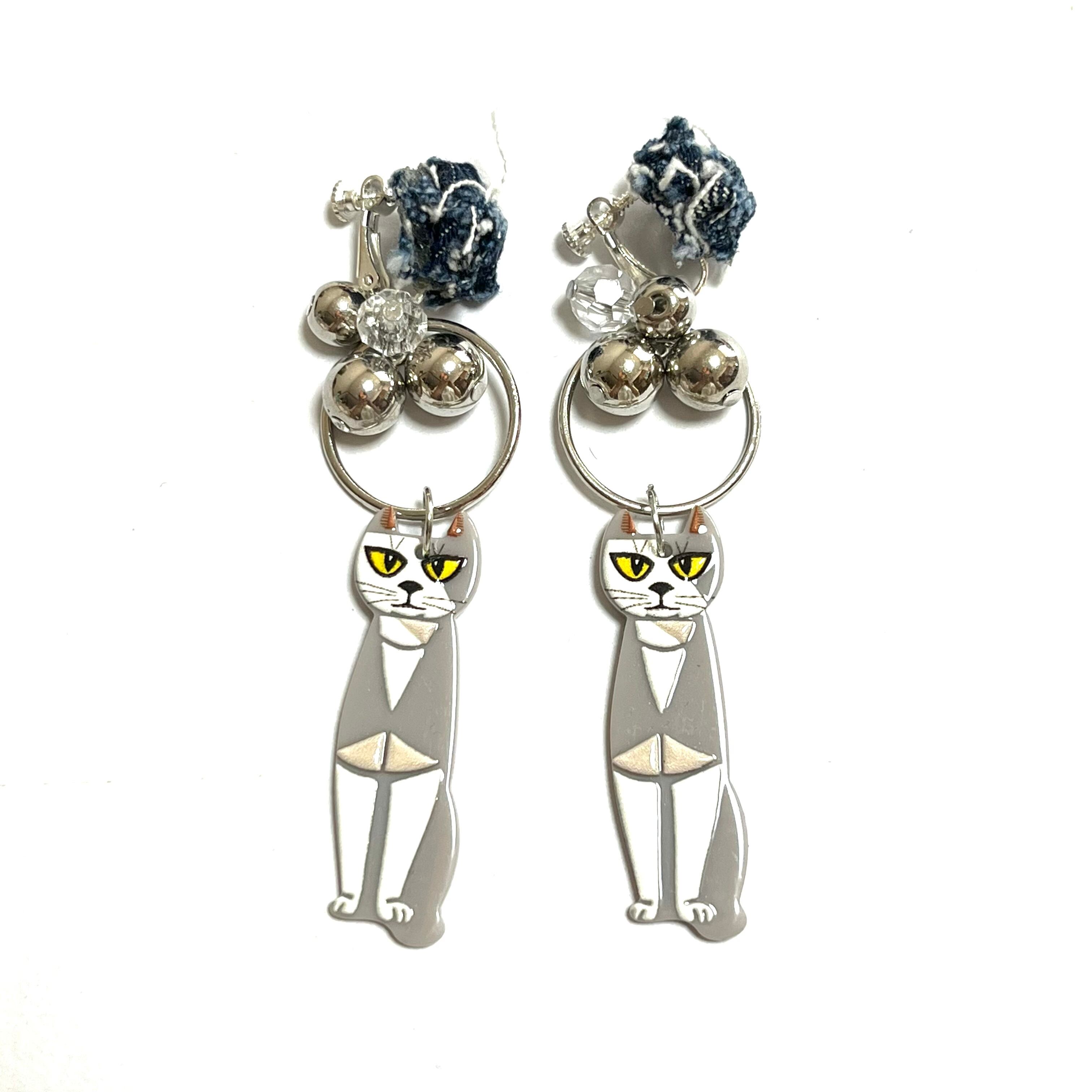 No.195 ねこさまイヤリング 大ぶり ねこ 一癖 クリア シルバー イヤリング デニムイヤリング 軽い シルバー 大ぶり チェーン 合金 カッコいい 金属アレルギー 個性的 個性派 クリア シリコンキャッチ | あいにー