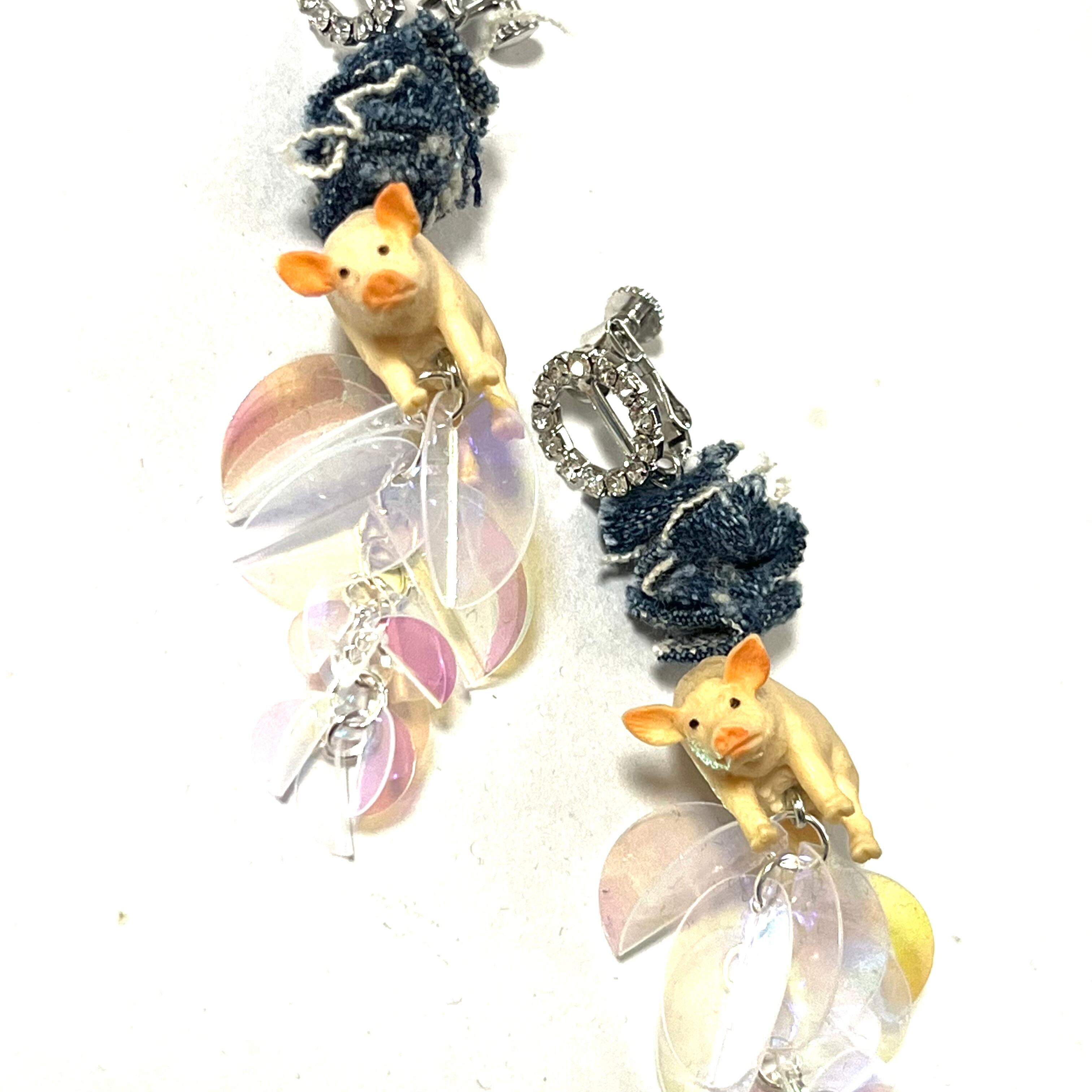 No.210 つぶらな瞳のこぶたちゃん イヤリング サージカルステンレスイヤリング スパンコール 軽い ステンレス シルバー 大ぶり チェーン 合金 カッコいい 金属アレルギー 個性的 個性派 クリア シリコンキャッチ