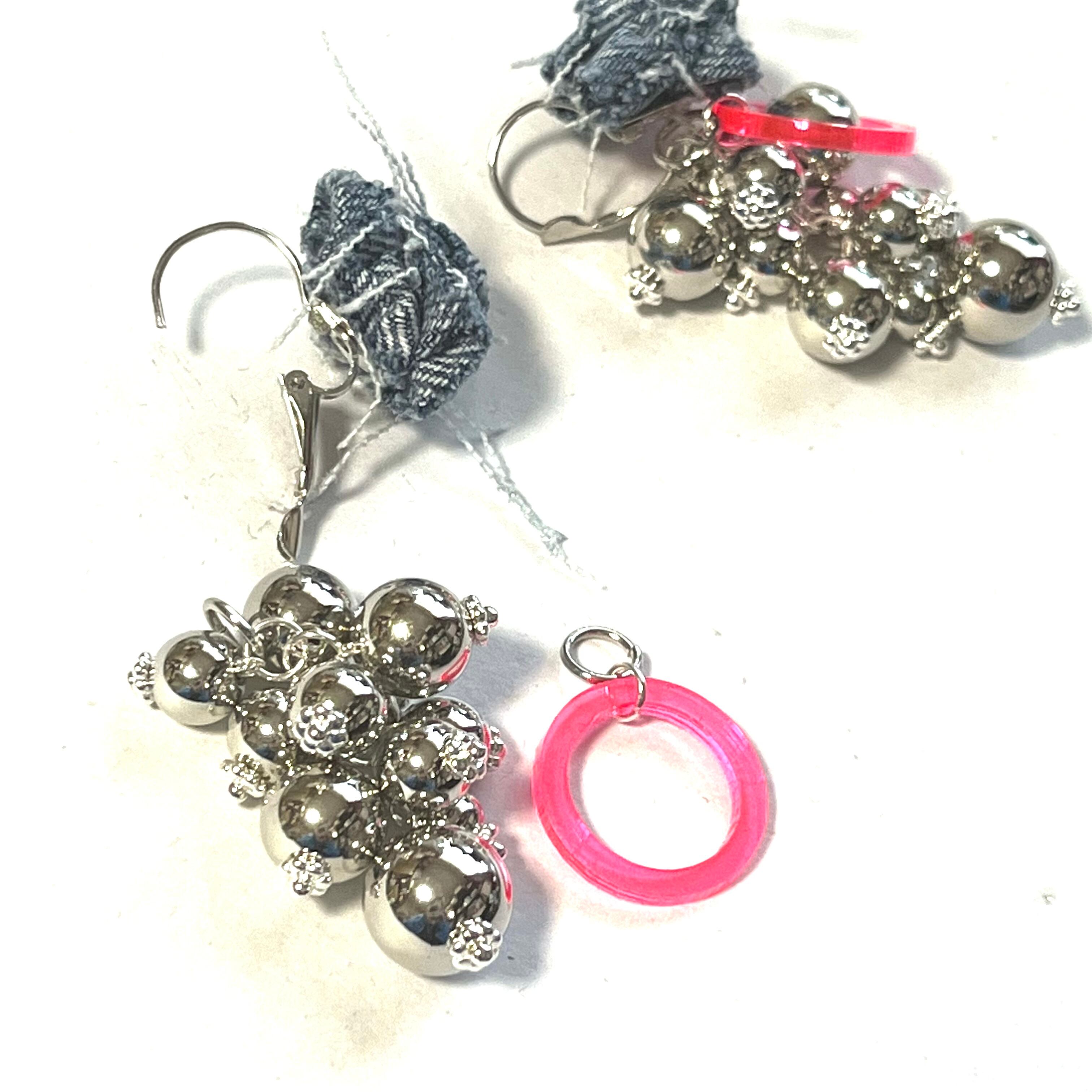 変わった形のピアスパーツに蛍光ピンクのリングと